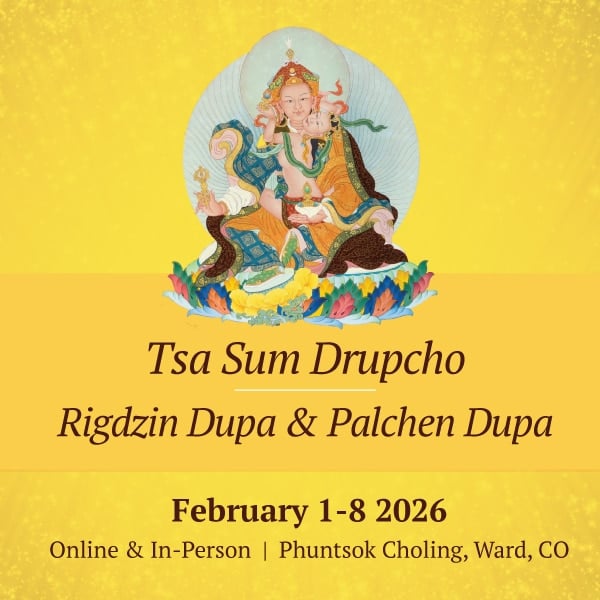 In the winter Tsa Sum Drupcho, Dzigar Kongtrul Rinpoche and MSB members practice the sadhanas of Ridgzin Dupa and Palchen Dupa from the Longchen Nyingtik tradition.